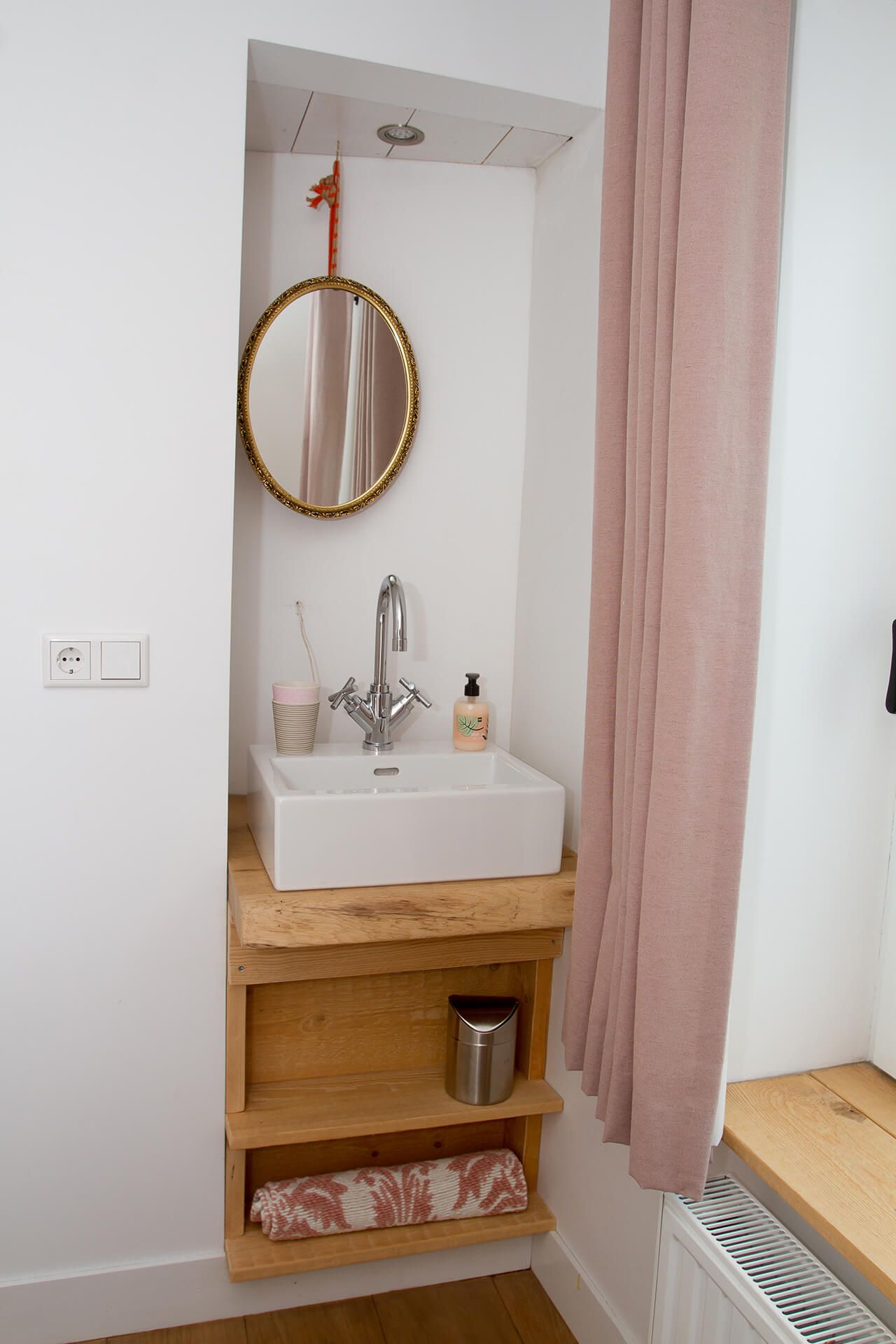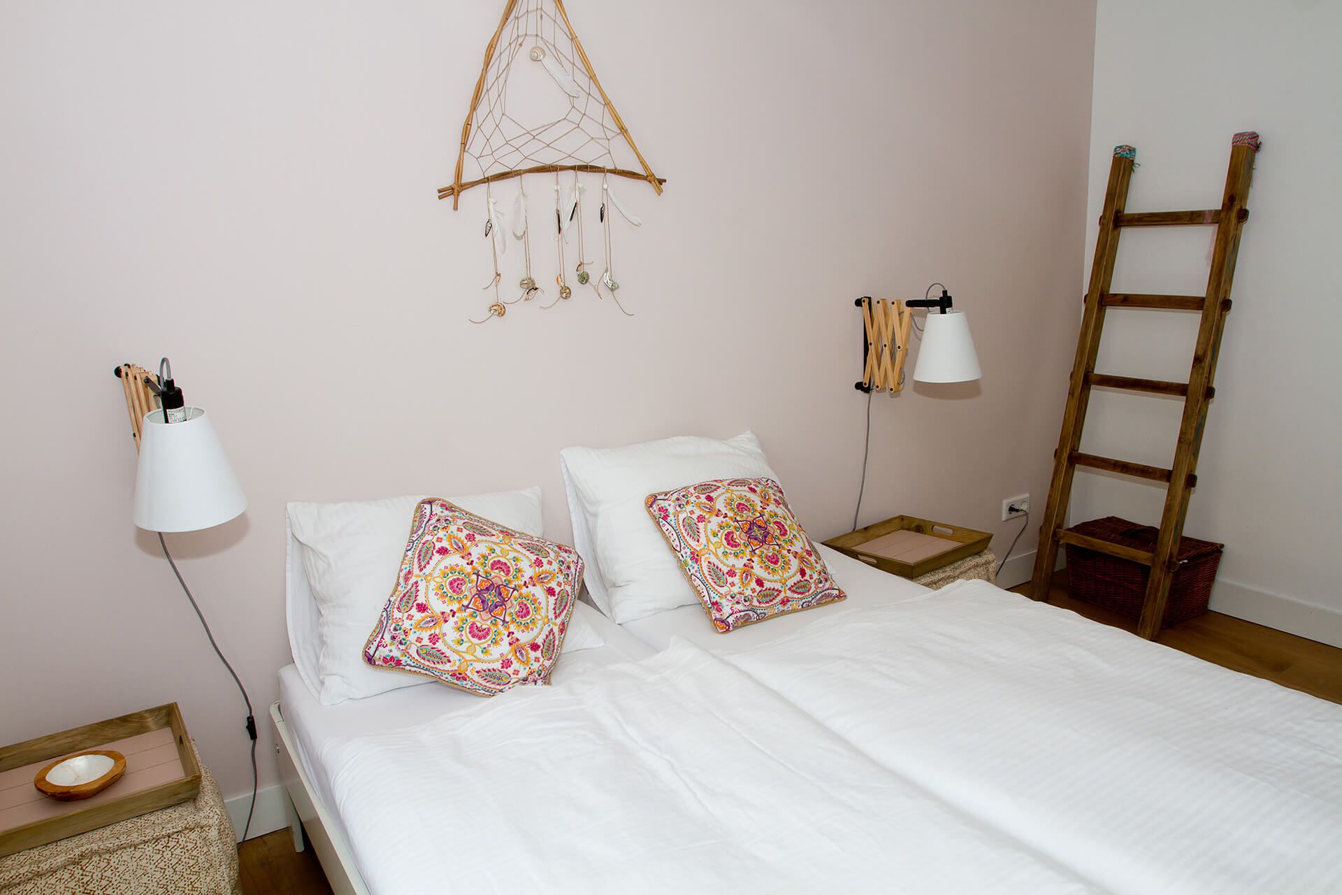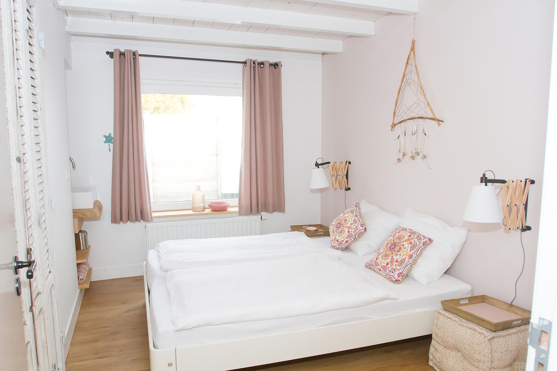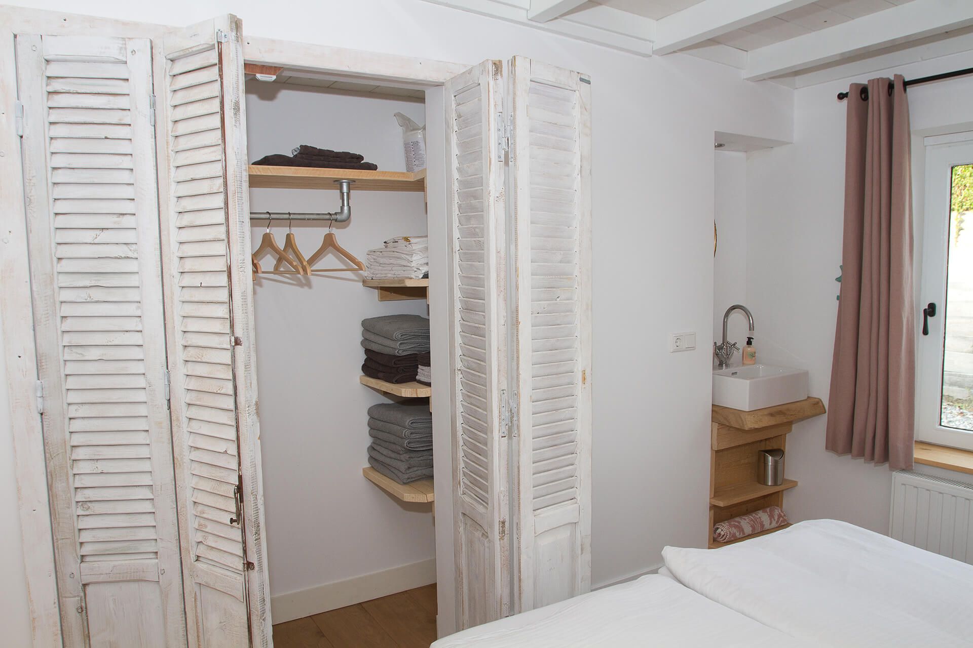 Een mooie ruime kamer in zachte tinten met houten vloer. Een tweepersoonsbed met 2 éénpersoons matrassen. In deze kamer is creatief gebruik gemaakt van de ruimte waardoor een grote kast met oude louvredeurtjes is gemaakt. In een nis is een mooie wastafel met schorsplank en kastjes gecreëerd. De kamer is verder gestyled met een dromenvanger, een decoratieve houten ladder van sloophout en grappige nachtkastjes en lampjes bij het bed.