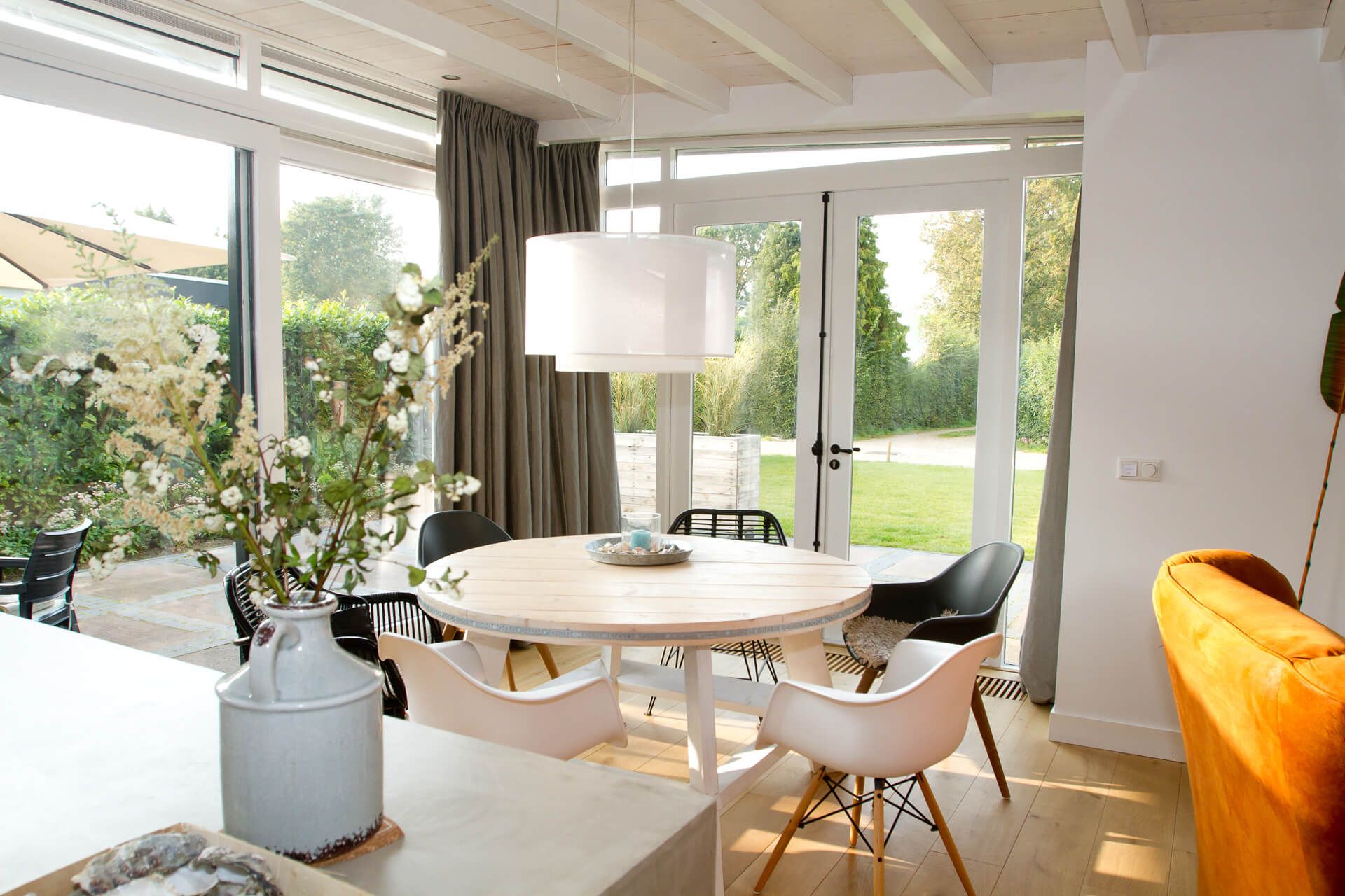 De ruime ronde tafel staat in de serre en biedt ruim plaats aan 6 personen. De verschillende stoelen zorgen voor een speels uiterlijk.