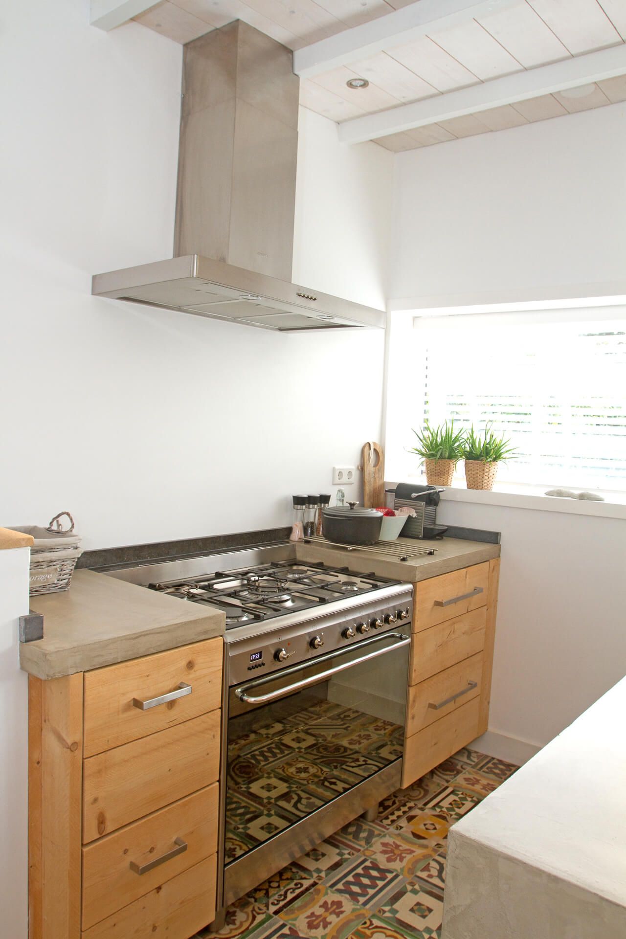 De keuken heeft een bijzonder stoere uitstraling en is voorzien van luxe inbouwapparatuur en een groot fornuis met 4 kookpitten, een wokbrander en een grote oven. De keuken is voorzien van lades met een steigerhouten front en het grote keukeneiland is afgewerkt met betonstuc.