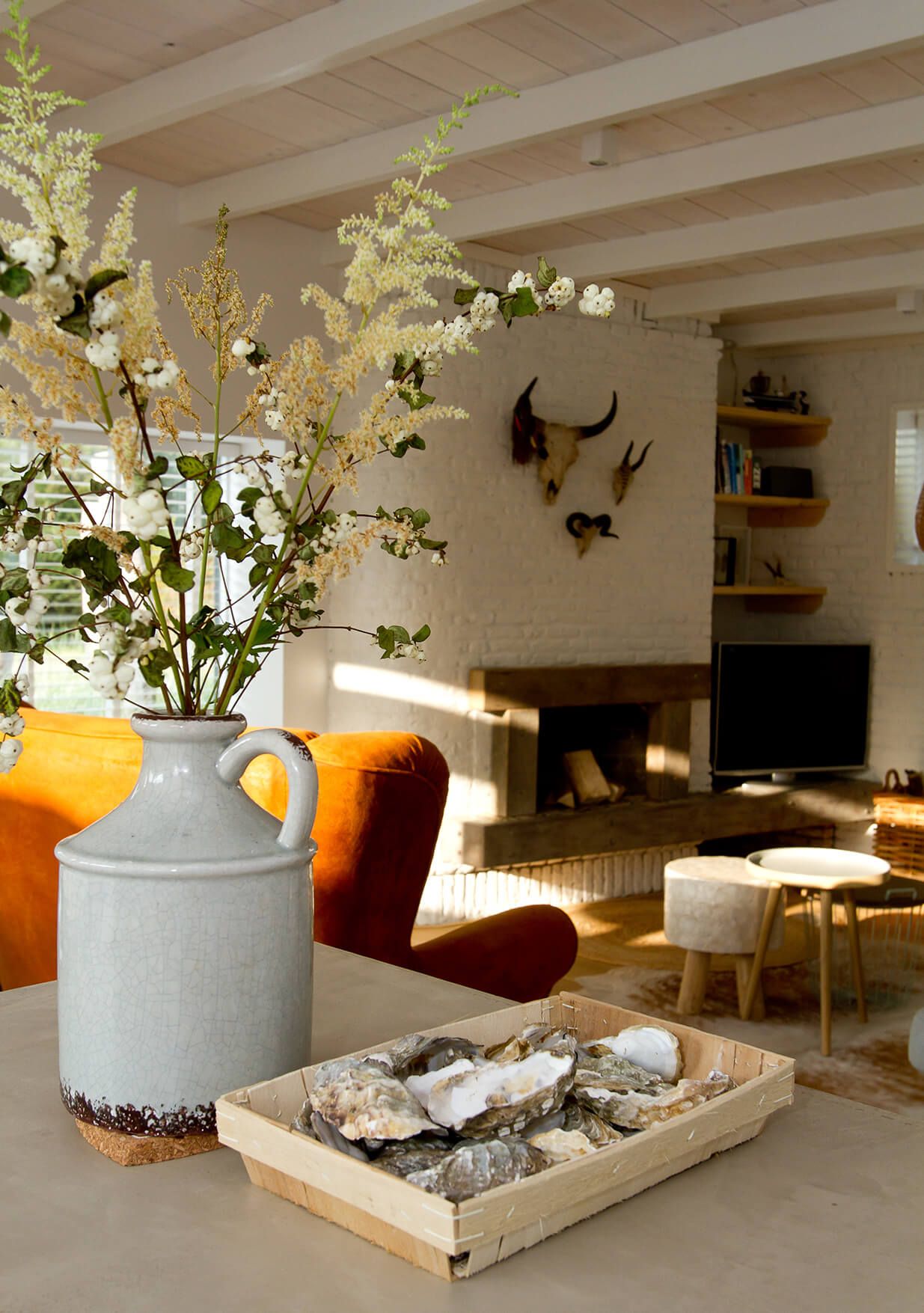 De living is ingericht met een zweempje Ibiza. Een mooie lichte eikenhouten vloer, open haard, witte wanden met vintage en nieuwe meubelen en sprekende decoraties. Aan de wanden en het plafond luxe verlichting waarvan bijna alle lichtbronnen dimbaar zijn.