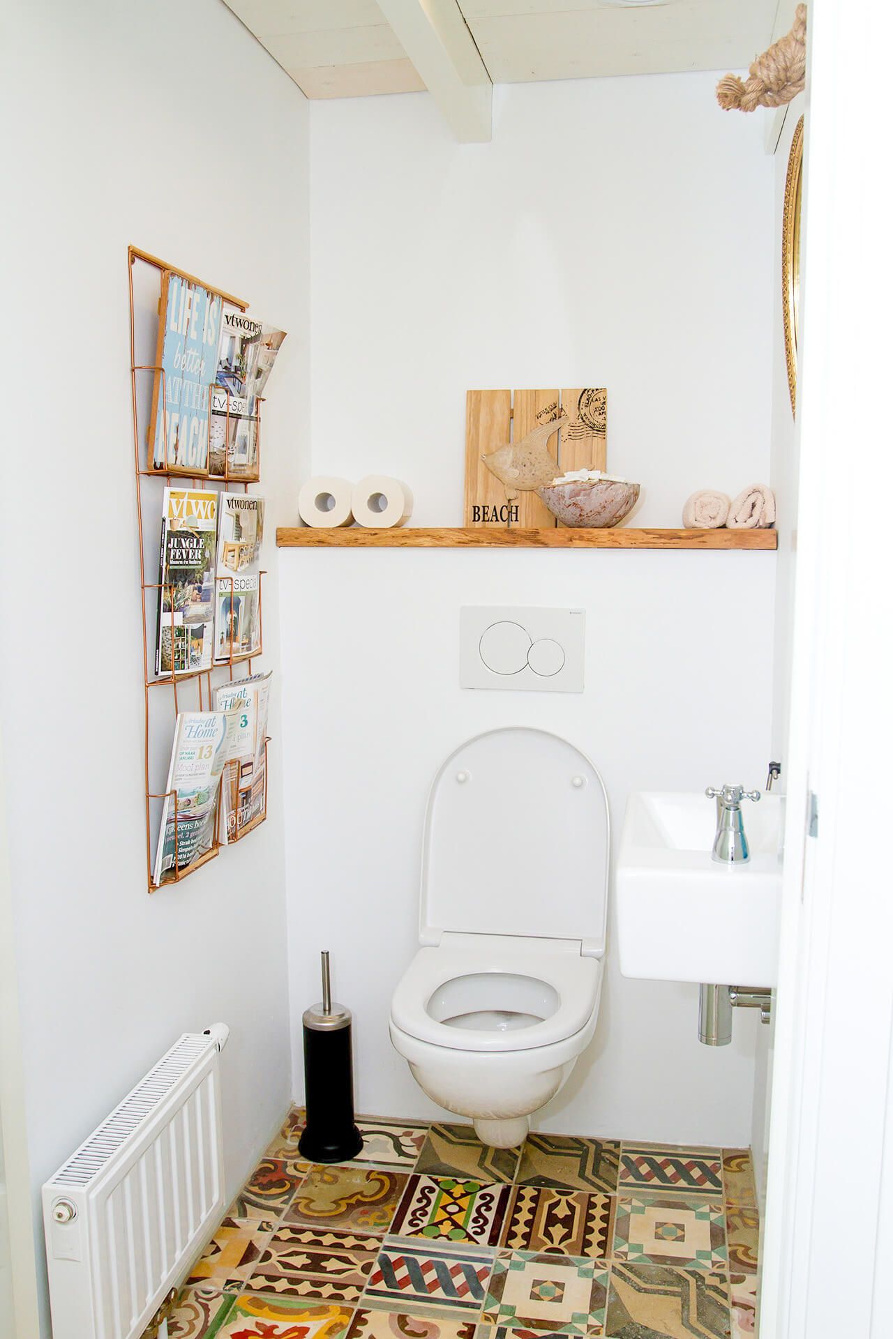 The toilet is styled with an amazing playful and old tile floor, a reading rack and a thick bark plank.